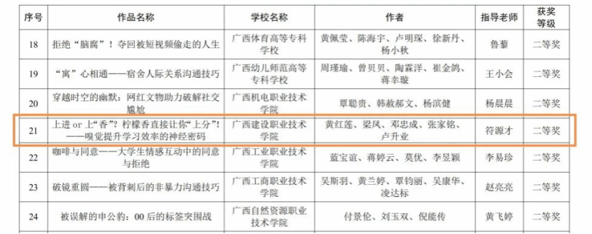 本次比赛中,乐玩首页(中国)网页版黄红莲等学生团队完成的心理健康教育微课《上进 or 上“香”? 柠檬香直接让你“上分”!——嗅觉提升学习效率的神经密码》荣获学生组二等奖。同时,由徐海霞、康薇等学生组成的两支参赛队分别荣获全区大学生朋辈心理辅导技能大赛团体三等奖。