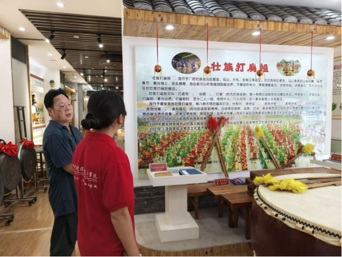 文化馆唐老师为实践团成员讲解壮族打扁担