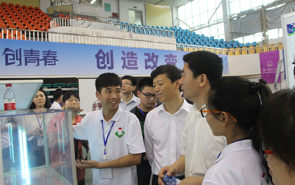 学生在”创青春“区赛决赛现场为自治区团委书记白松涛讲解系统模型