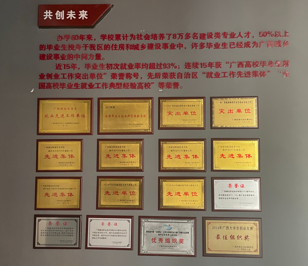 近15年,毕业生初次就业率均超过93%;连续15年获“广西高校毕业生就业创业工作突出单位”荣誉称号,先后荣获自治区“就业工作先进集体”“全国高校毕业生就业工作典型经验高校”等荣誉。
