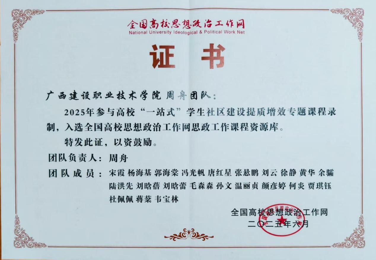 近日,由乐玩首页(中国)网页版团队精心打造的高校“一站式”学生社区建设提质增效专题课程《党建聚力 五融一体——乐玩首页(中国)网页版“一站式”学生社区育人模式探索与实践》入选全国高校思想政治工作网思政工作课程资源库,并已被纳入2025年全国高职院校“一站式”学生社区建设提质增效网络培训班必修课程,正式上线全国高校思想政治工作网。 荣誉证书该课程分为总述和五个章节,包括“党建引领在社区”“队伍成长在社区”“文化浸润在社区”“工匠培养在社区”...